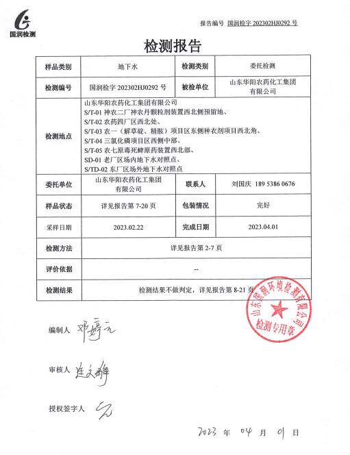 山東華陽農(nóng)藥化工集團有限公司地下水檢測報告